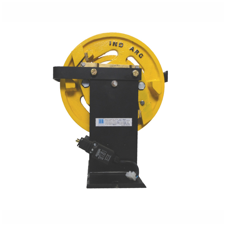 Limitador de velocidad con disparo por acción centrifuga y actuación de paracaídas por tracción por adherencia. Apto para actuar paracaídas de cabina de tipo instantáneo, semiprogresivo y progresivo.